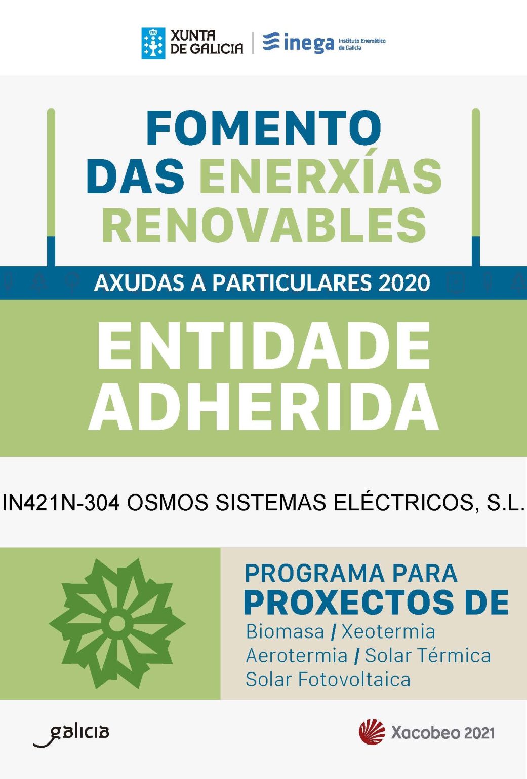 Dentro del programa de Ayudas a particulares, OSMOS SISTEMAS ELECTRICOS S.L. es entidad colaboradora para proyectos de energías renovables para uso térmico y para proyectos de energía fotovoltaica, siempre destinados a particulares durante el 2020 y dentro del programa de Proyectos de Biomasa, Xeotermia, Aerotermia, Solar térmica y solar fotovoltáica.
